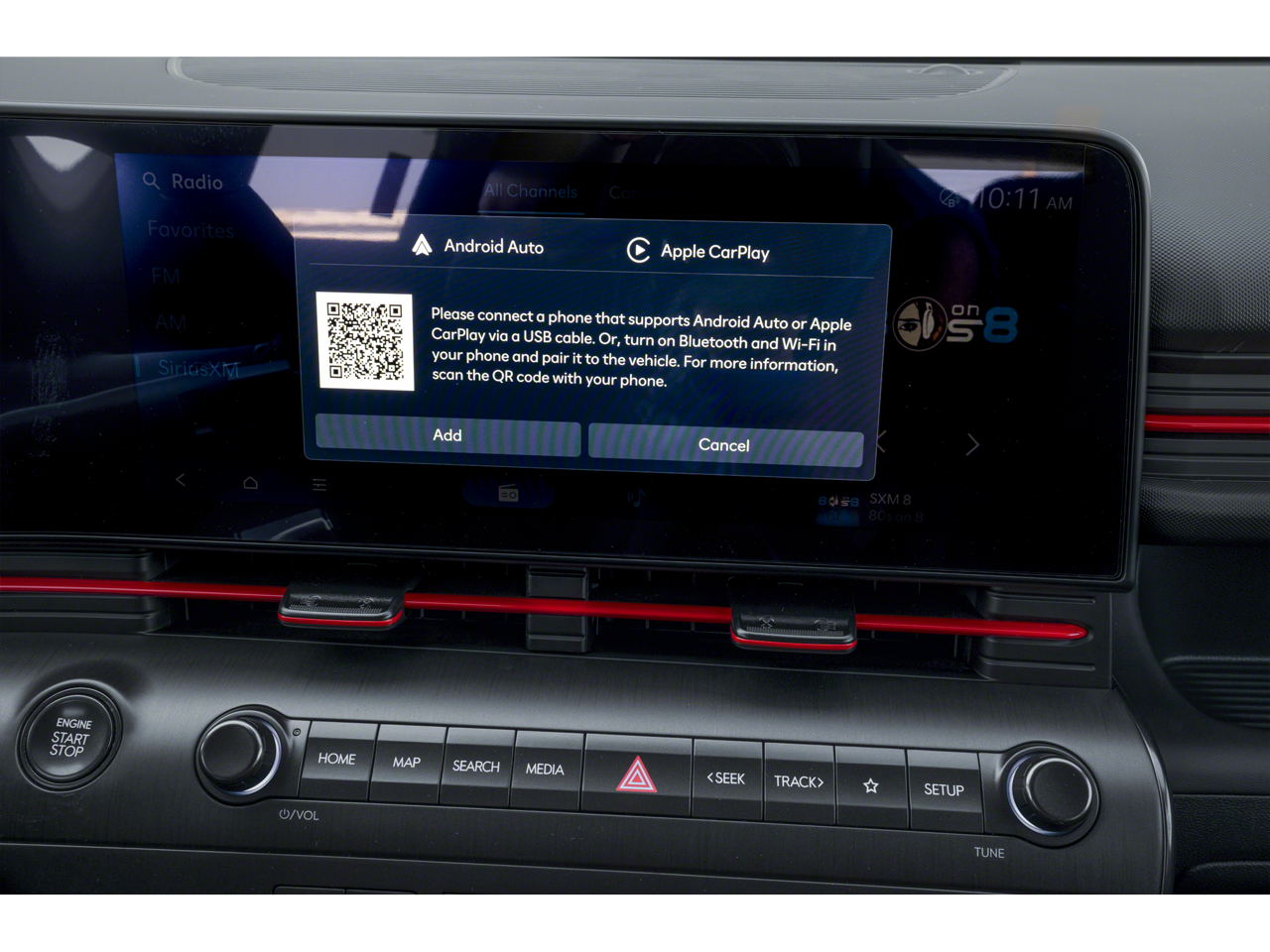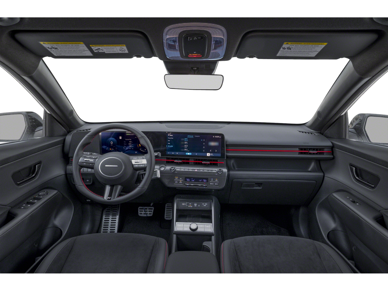 Equipped with Option Group 01, 4-Wheel Disc Brakes, 6 Speakers, ABS brakes, Air Conditioning, All Season Fitted Liners, Alloy wheels, AM/FM radio: SiriusXM, Apple CarPlay & Android Auto, Auto High-beam Headlights, Automatic temperature control, Brake assist, Bumpers: body-color, Cargo Net, Cargo Tray, Carpeted Floor Mats, Column-Mounted Shift-By-Wire, Delay-off headlights, Driver door bin, Driver vanity mirror, Dual front impact airbags, Dual front side impact airbags, Electronic Stability Control, Emergency communication system: Bluelink+, Exterior Parking Camera Rear, First Aid Kit, Four wheel independent suspension, Front anti-roll bar, Front Bucket Seats, Front Center Armrest, Front dual zone A/C, Front reading lights, Fully automatic headlights, Heated door mirrors, Heated front seats, Heated Front Sport Bucket Seats, Illuminated entry, Leather steering wheel, Low tire pressure warning, Mud Guards, N-Line Alcantara Sport Combination Seat Trim, Occupant sensing airbag, Outside temperature display, Overhead airbag, Panic alarm, Passenger door bin, Passenger vanity mirror, Power door mirrors, Power driver seat, Power steering, Power windows, Radio: AM/FM/HD Radio/SiriusXM Audio System, Rear anti-roll bar, Rear seat center armrest, Rear window defroster, Rear window wiper, Remote keyless entry, Security system, Speed control, Speed-sensing steering, Split folding rear seat, Spoiler, Steering wheel mounted audio controls, Tachometer, Telescoping steering wheel, Tilt steering wheel, Traction control, Trip computer, Turn signal indicator mirrors, Variably intermittent wipers, and Wheels: 19 x 7.5J Metallic Alloy.